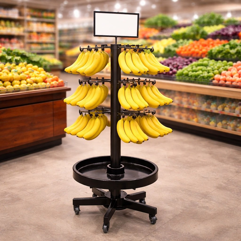Built with a sturdy metal or aluminum frame and food-grade baskets or hooks, the banana stand supports natural ripening and easy customer access. Its compact footprint makes it ideal for fresh produce zones, aisle ends, or promotional areas.